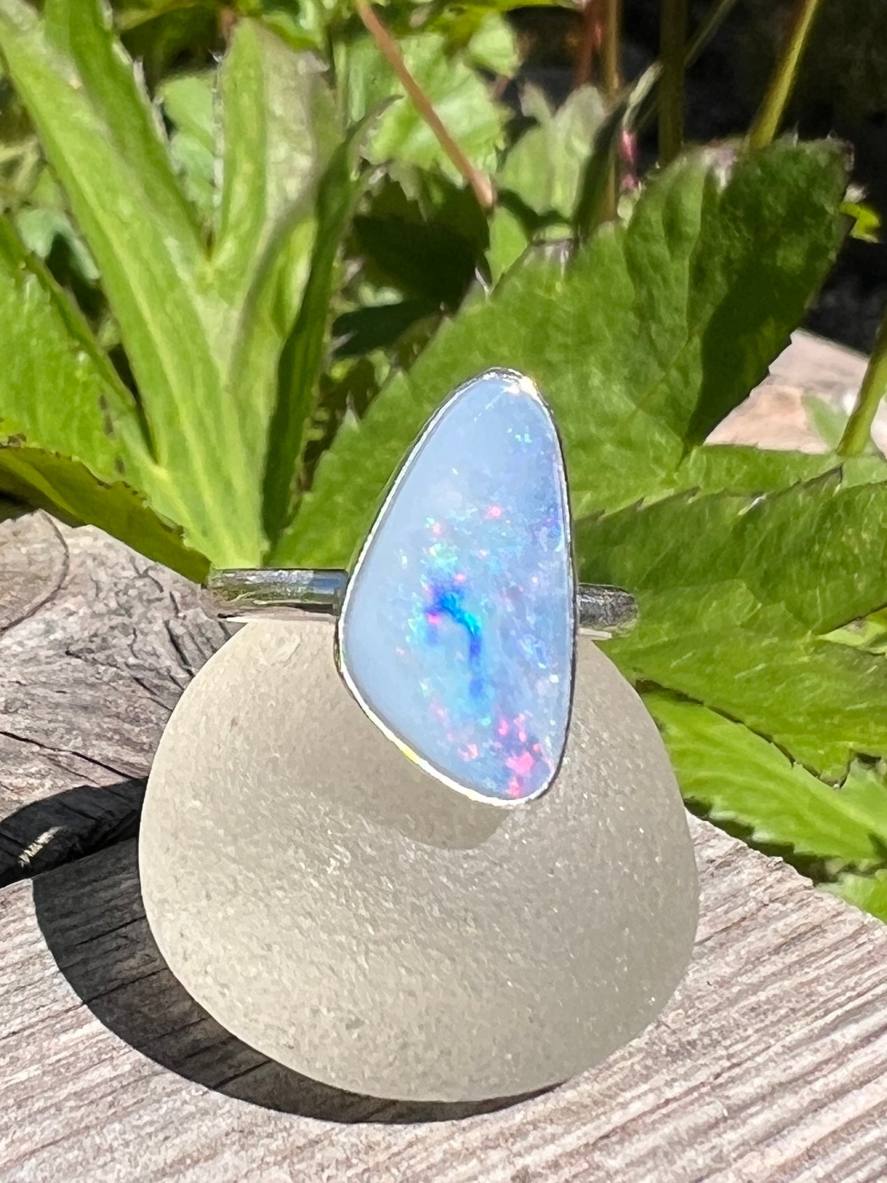 This gorgeous Australian Opal doublet has wrapped in a fine silver bezel set on a fine silver back plate and sterling silver band.