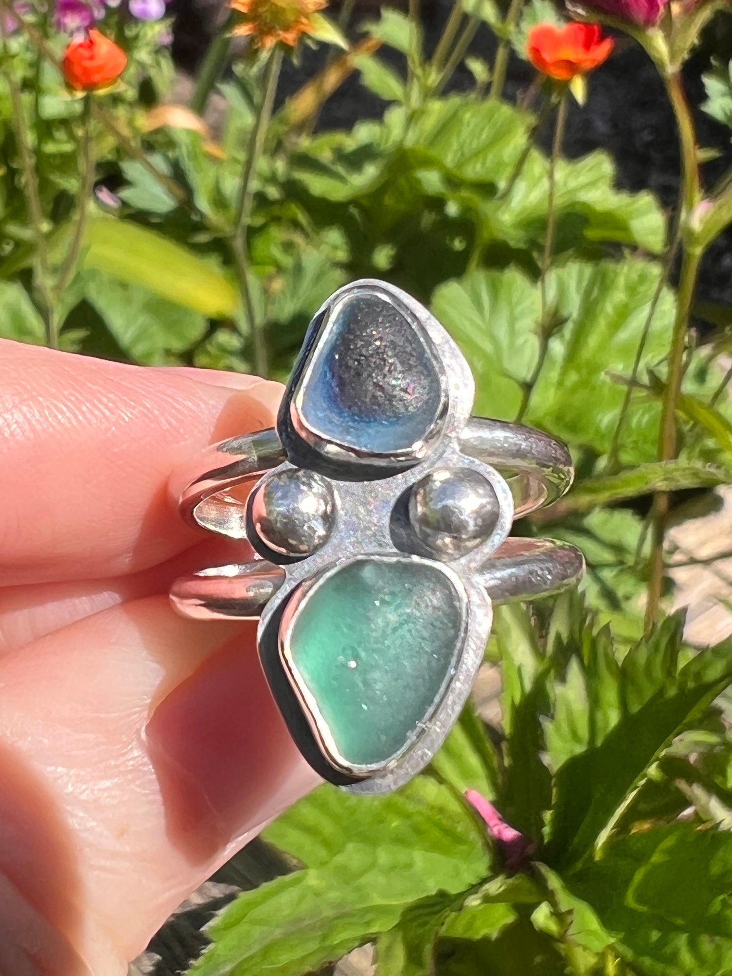 Made with a 2 pieces of English sea glass, wrapped in a fine silver bezel set on a sterling silver back plate and on a double sterling silver band.