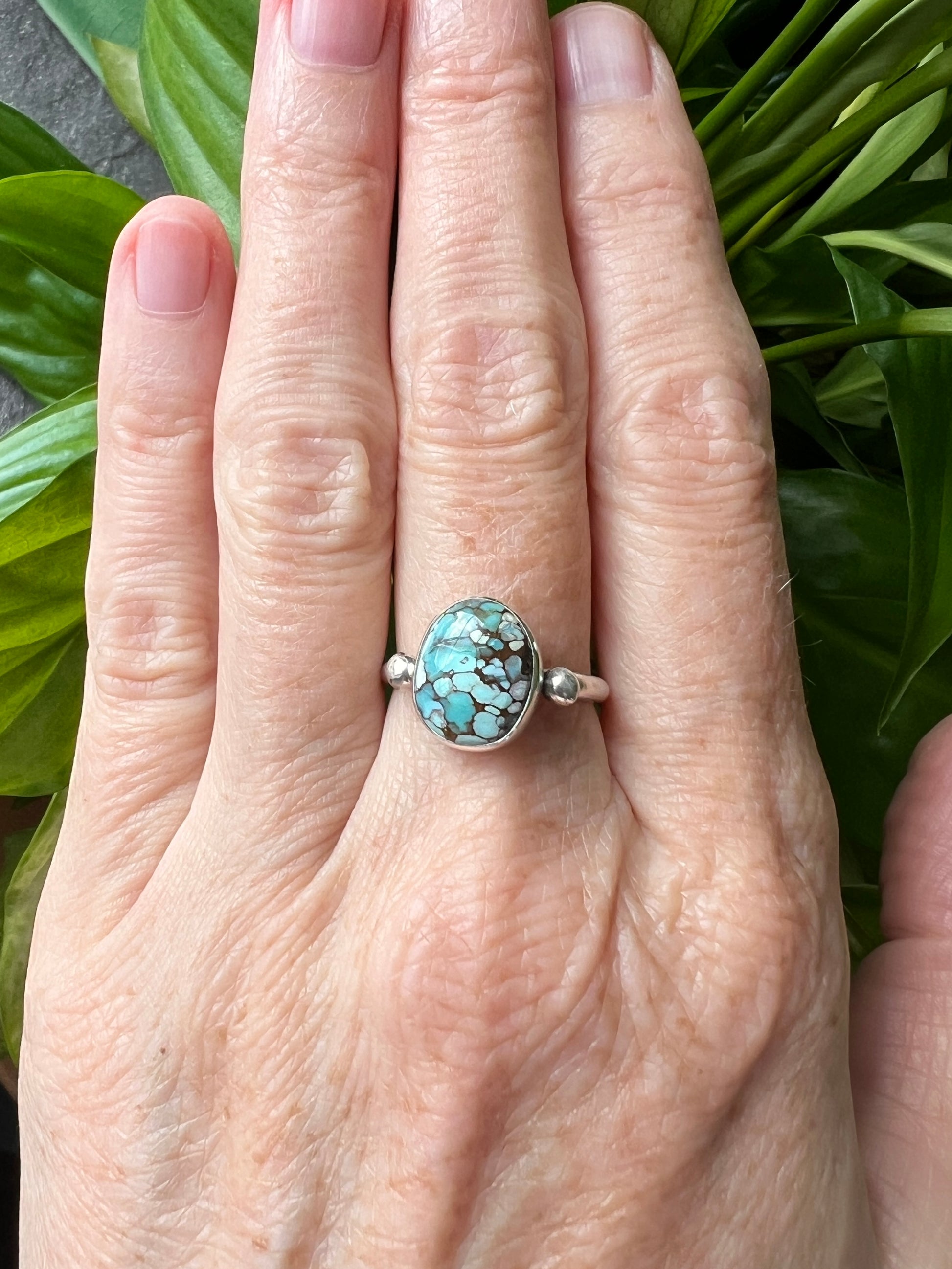 This lovely Hubei Turquoise has wrapped in a fine silver bezel set on a fine silver back plate and sterling silver band.