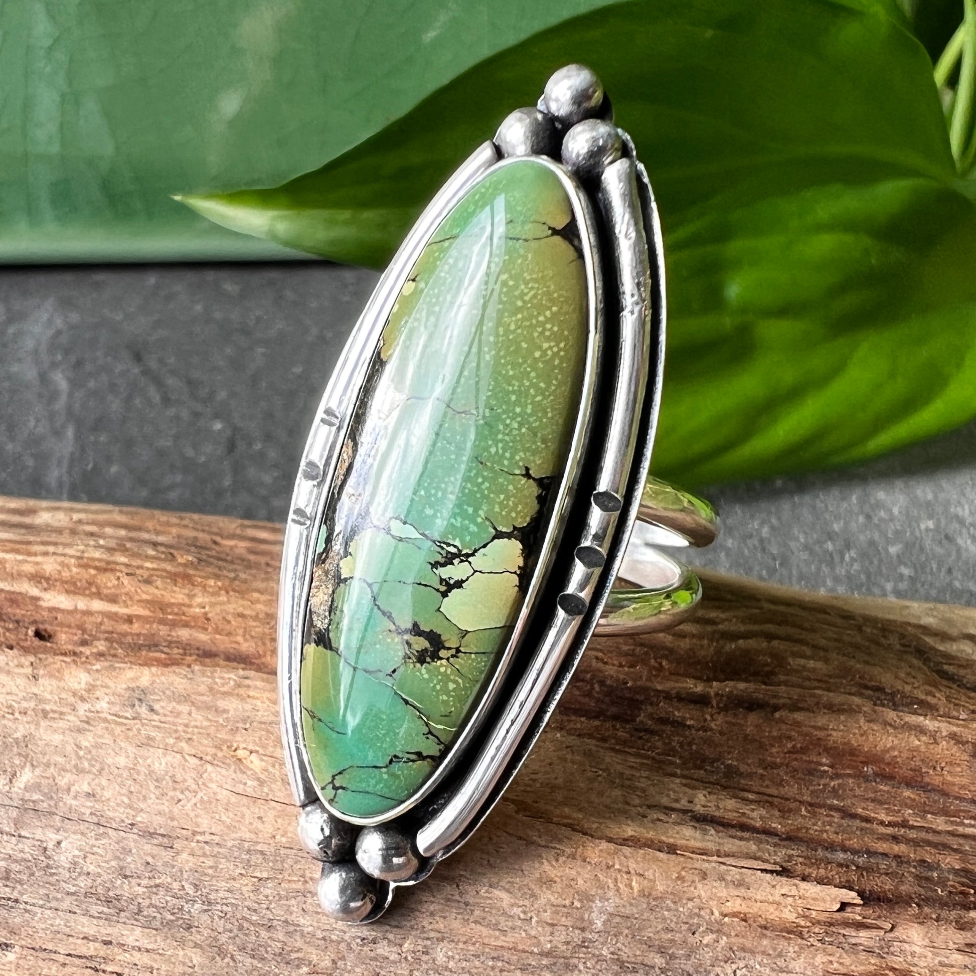 This beautiful Hubei Turquoise has been wrapped in a fine silver bezel set on a fine silver back plate and sterling silver band. The ring measures 4cm x 1.6cm.