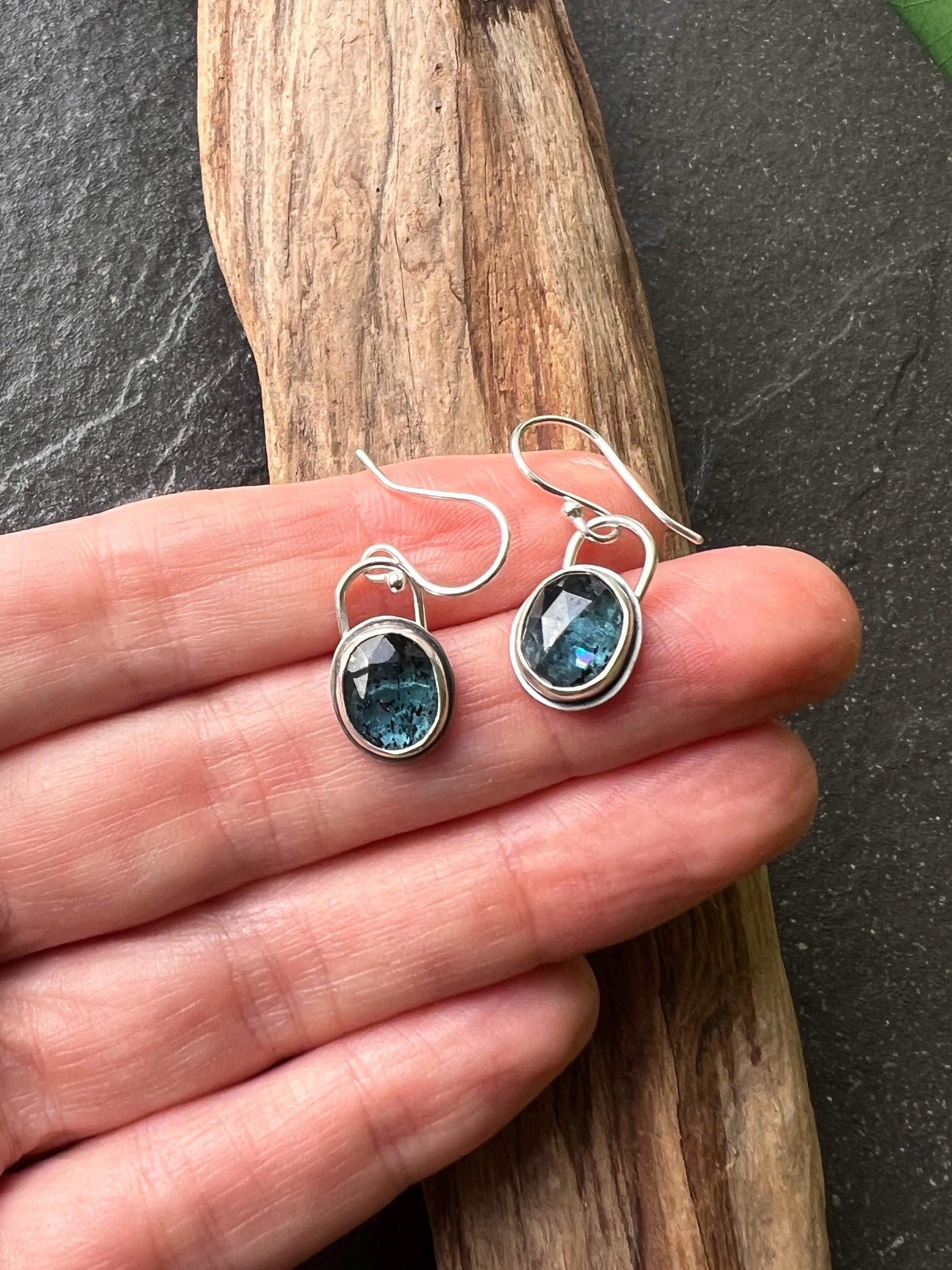 I have made these lovely little earrings using Indigo Moss Kyanite sterling and fine silver. The earrings are suspended from a handmade sterling silver ear wire.
