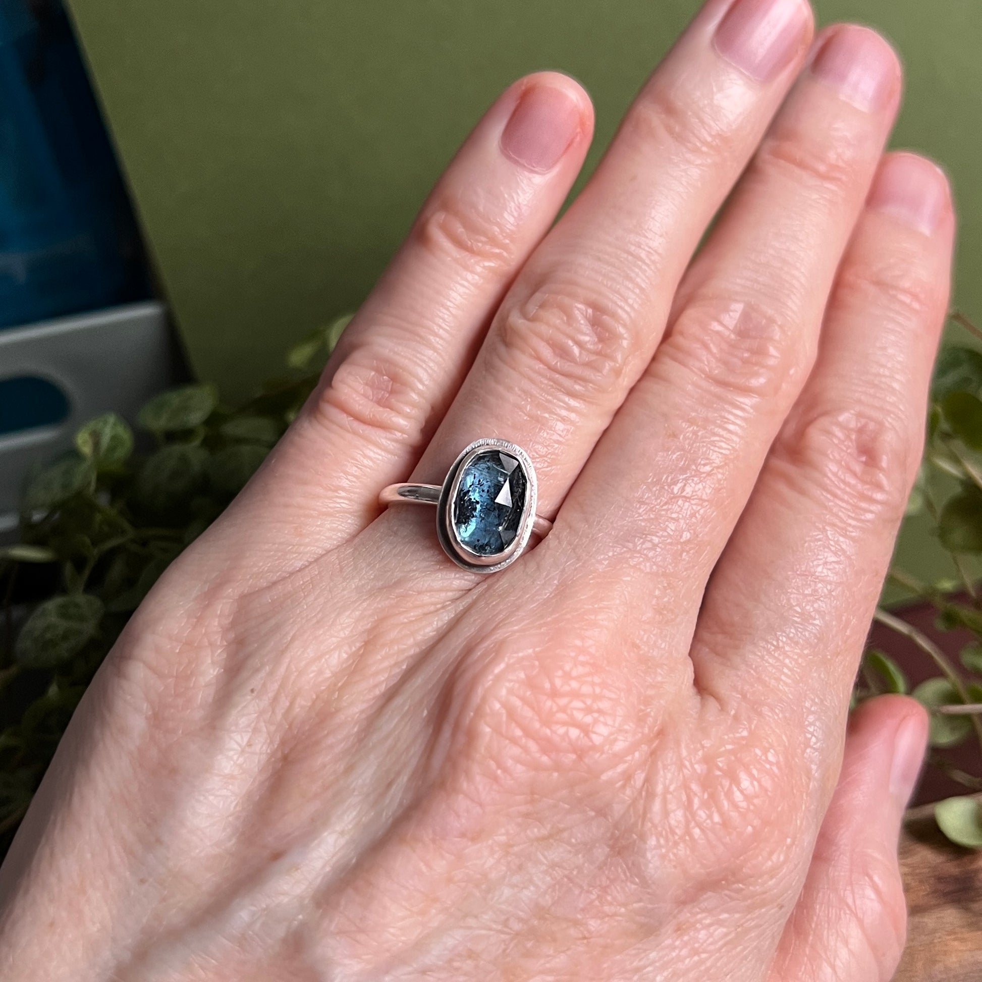 These Indigo Moss Kyanite stones are gorgeous! This stone has been wrapped in a fine silver bezel set on a sterling silver back plate and band.
