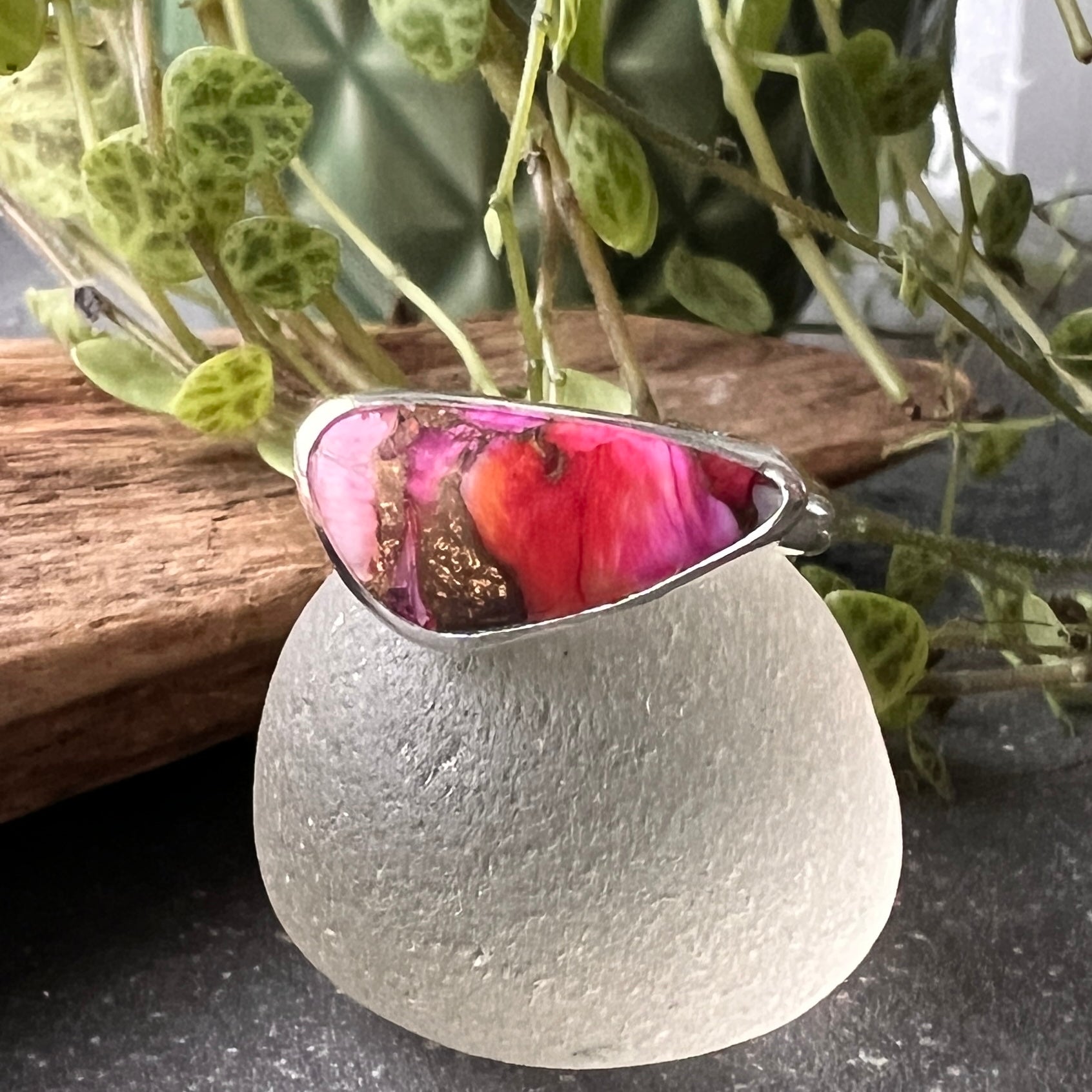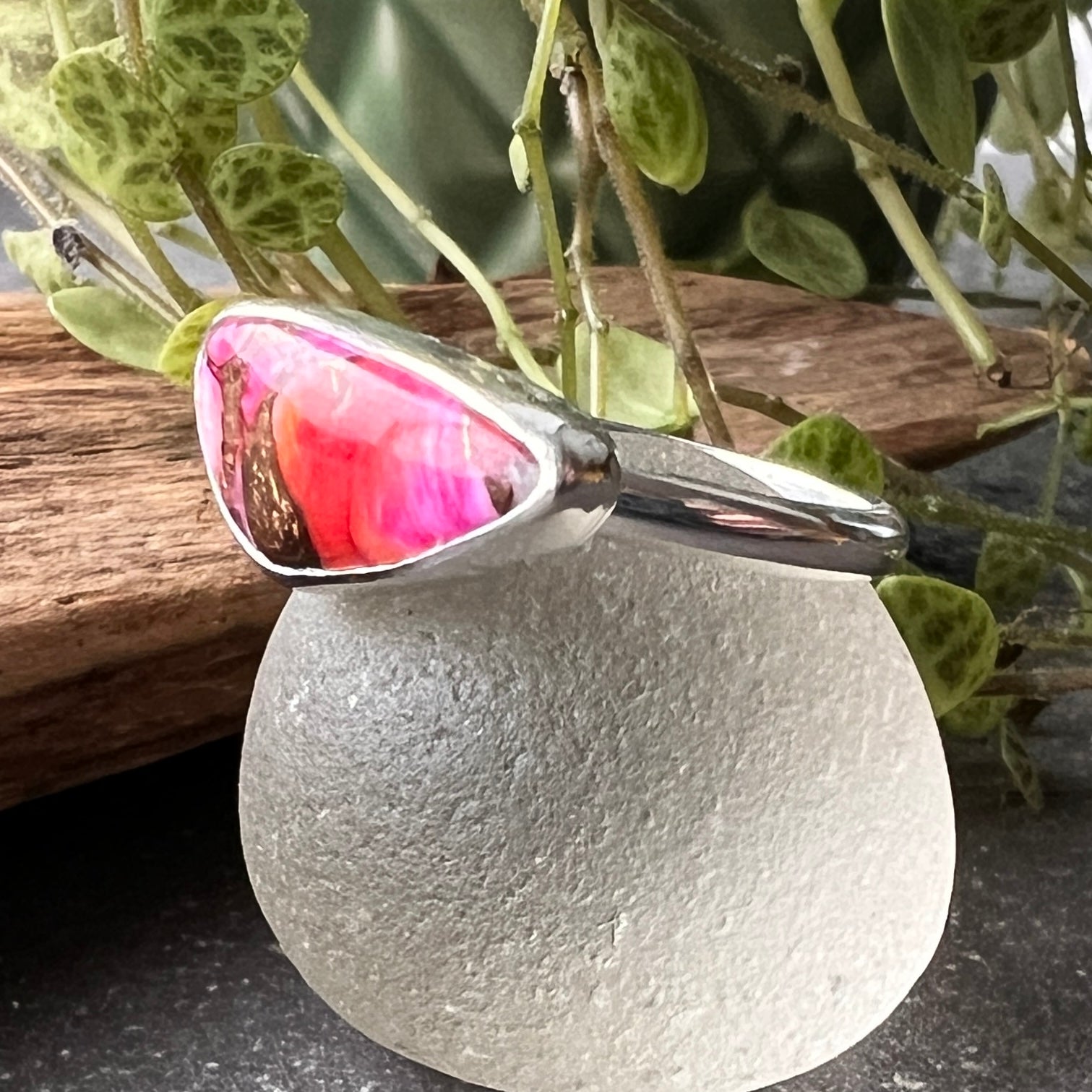 This lovely Mohave Turquoise has wrapped in a fine silver bezel set on a fine silver back plate and sterling silver band.