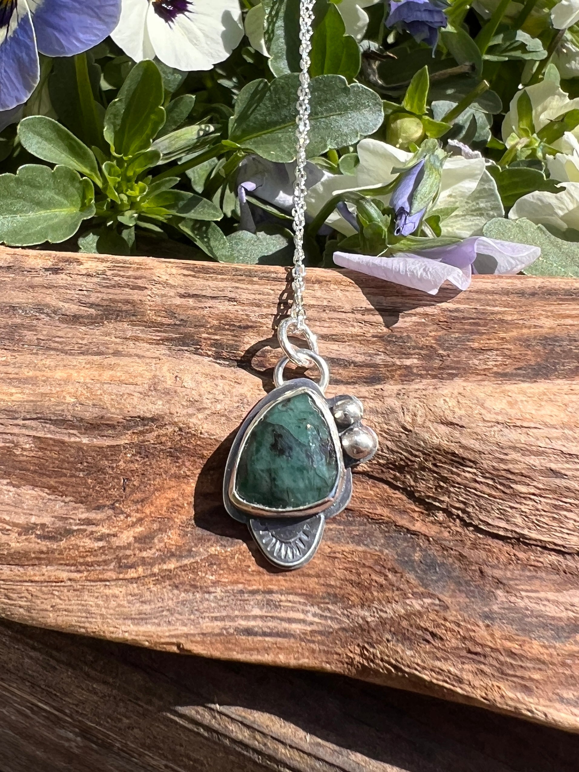 I love the tones in this Natural Emerald stone. I have wrapped the stone in a fine silver bezel, mounted on a sterling silver back plate.