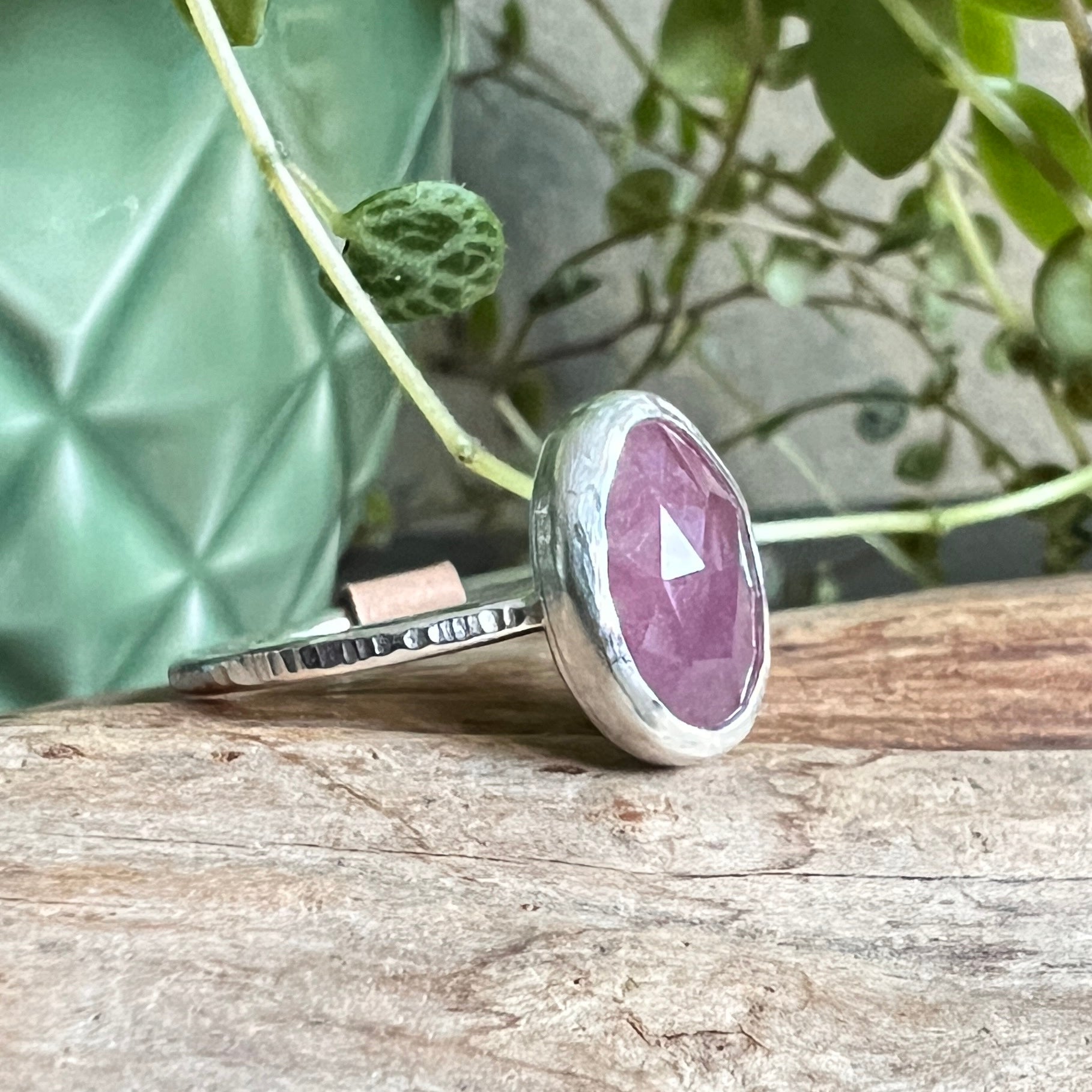 This Natural Pink Sapphire stone has been wrapped in a fine silver bezel set on a sterling silver back plate and on a sterling silver band.
