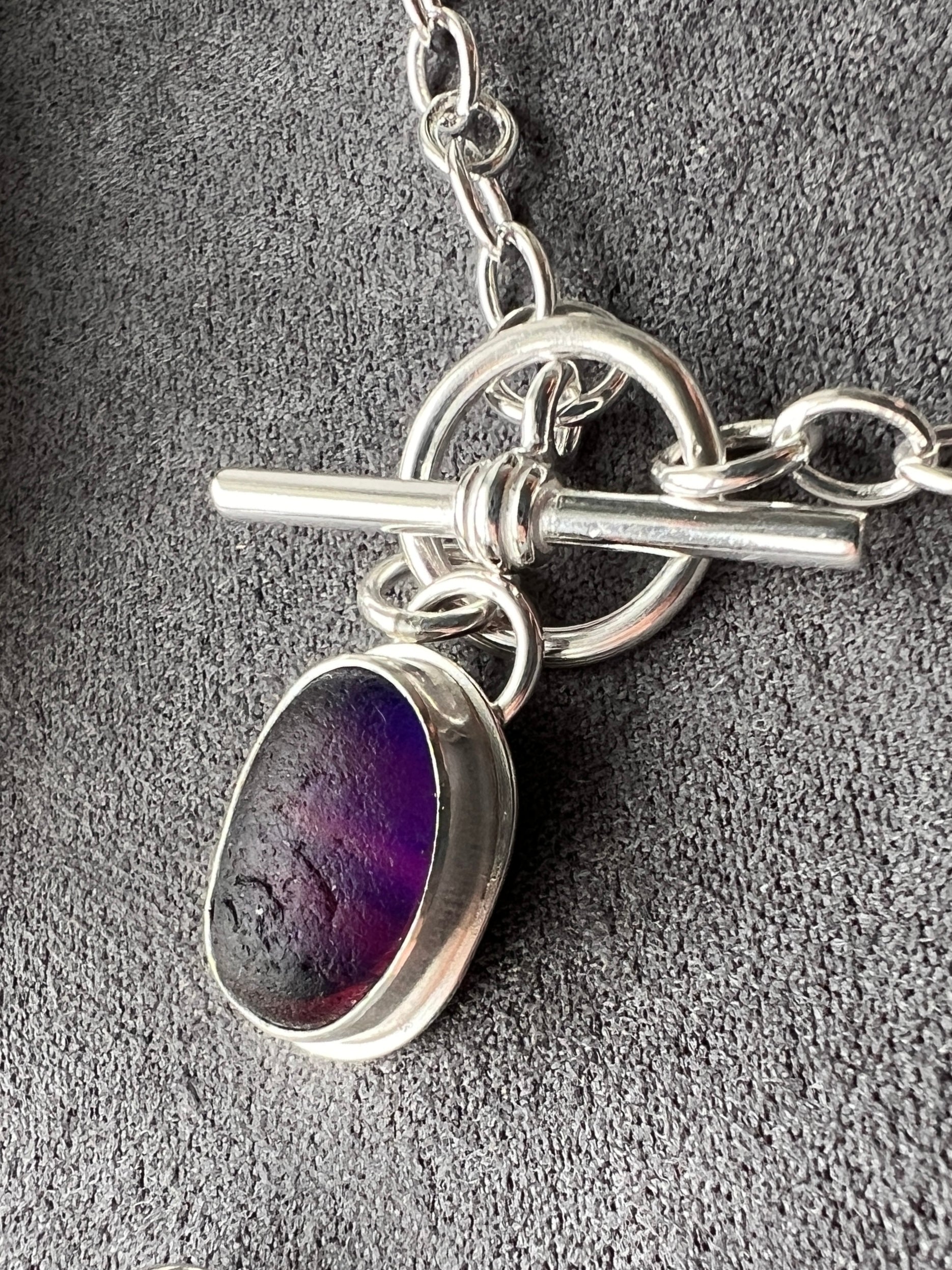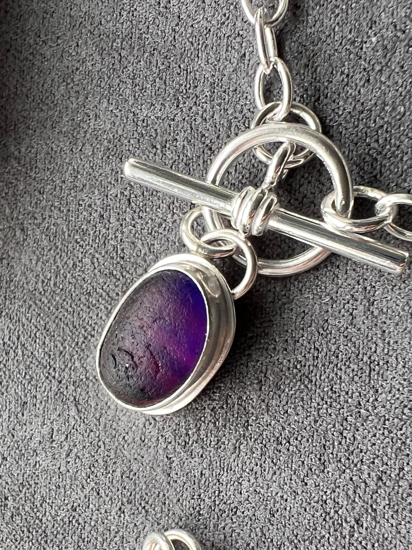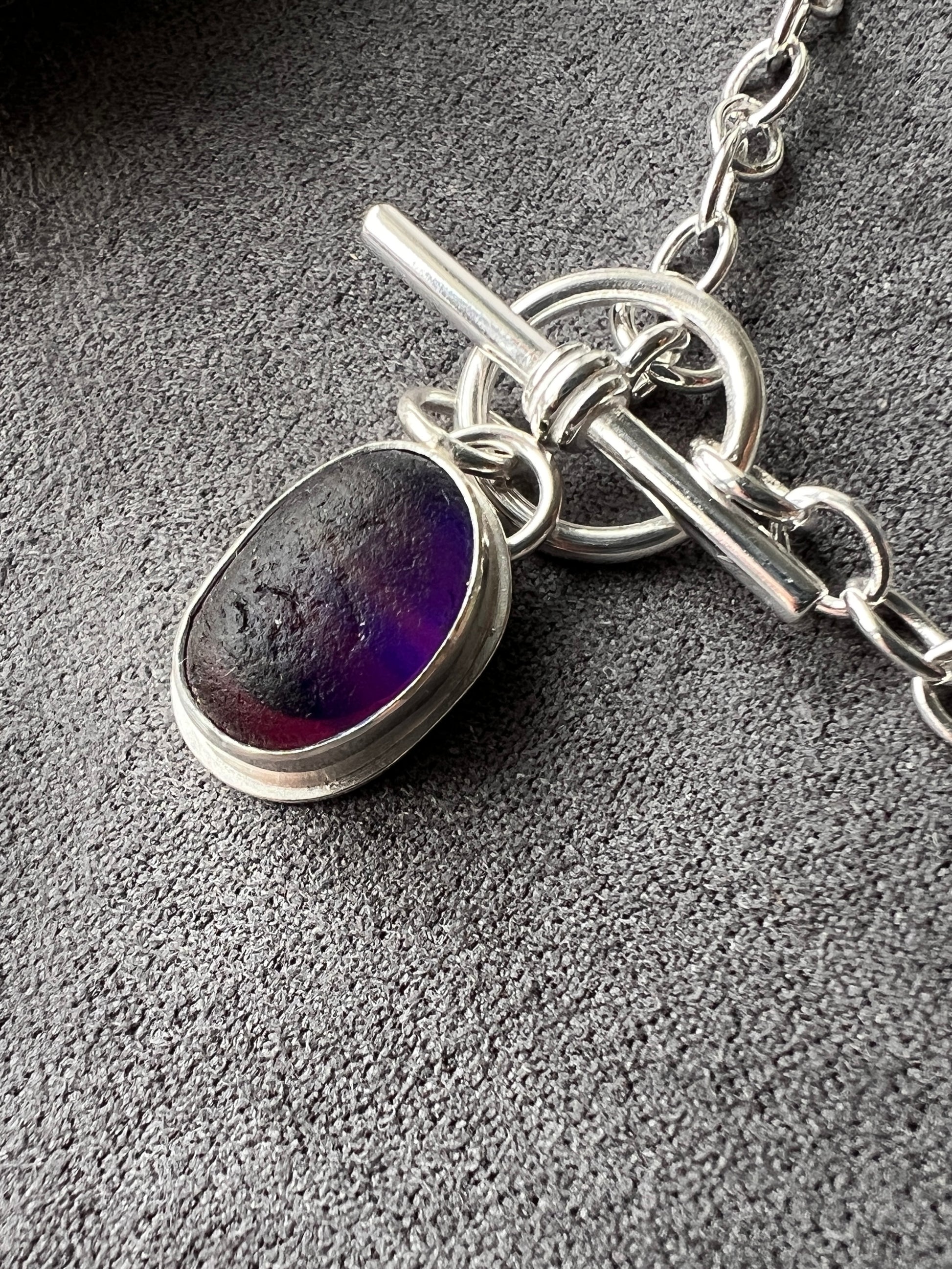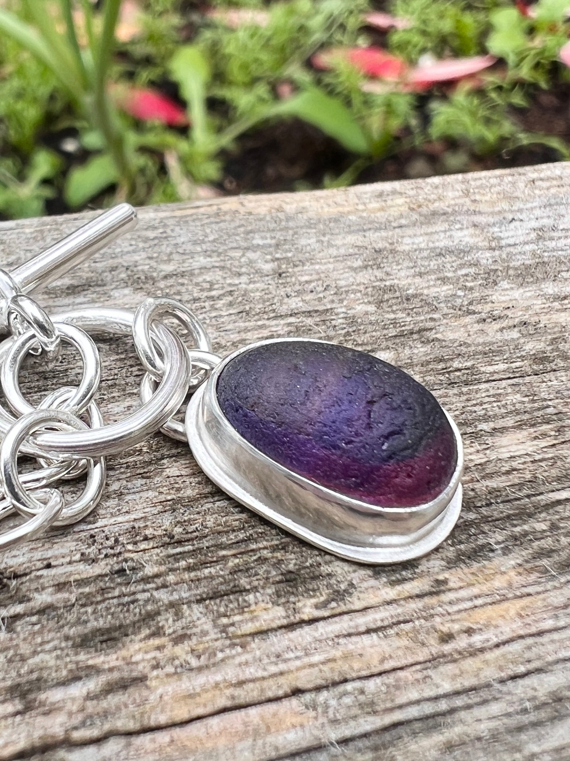 Silver bracelet with a T-bar fastening set with a beautiful multicoloured piece of sea glass.