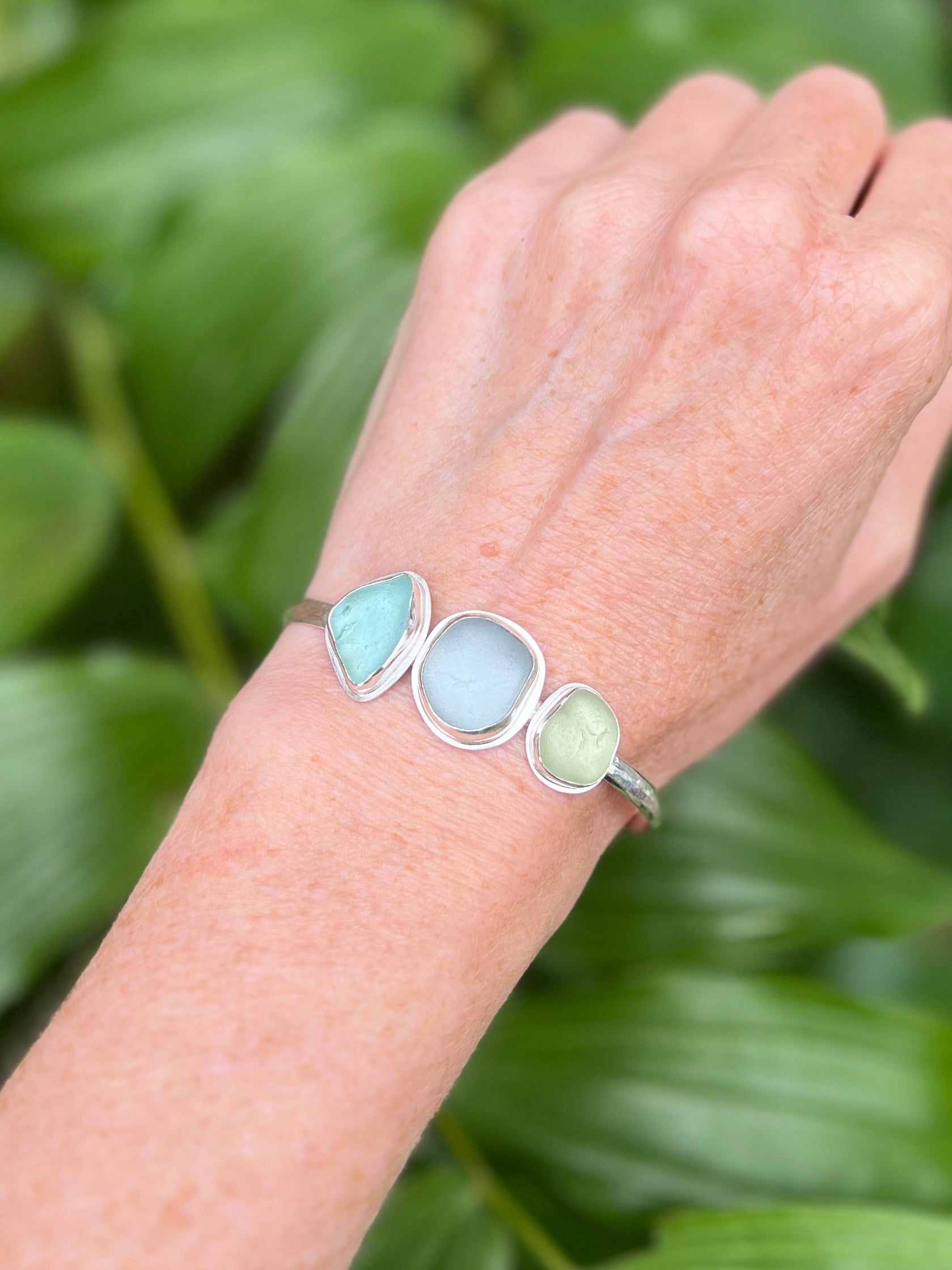 I have created this silver hammered cuff for these beautifully coordinating pieces of sea glass using recycled sterling silver. It is designed to be slid on your wrist from the side and is to be adjusted by gently squeezing once on your wrist so it fits snugly and does not slide up and down. 1 inch gap to slid your wrist into.