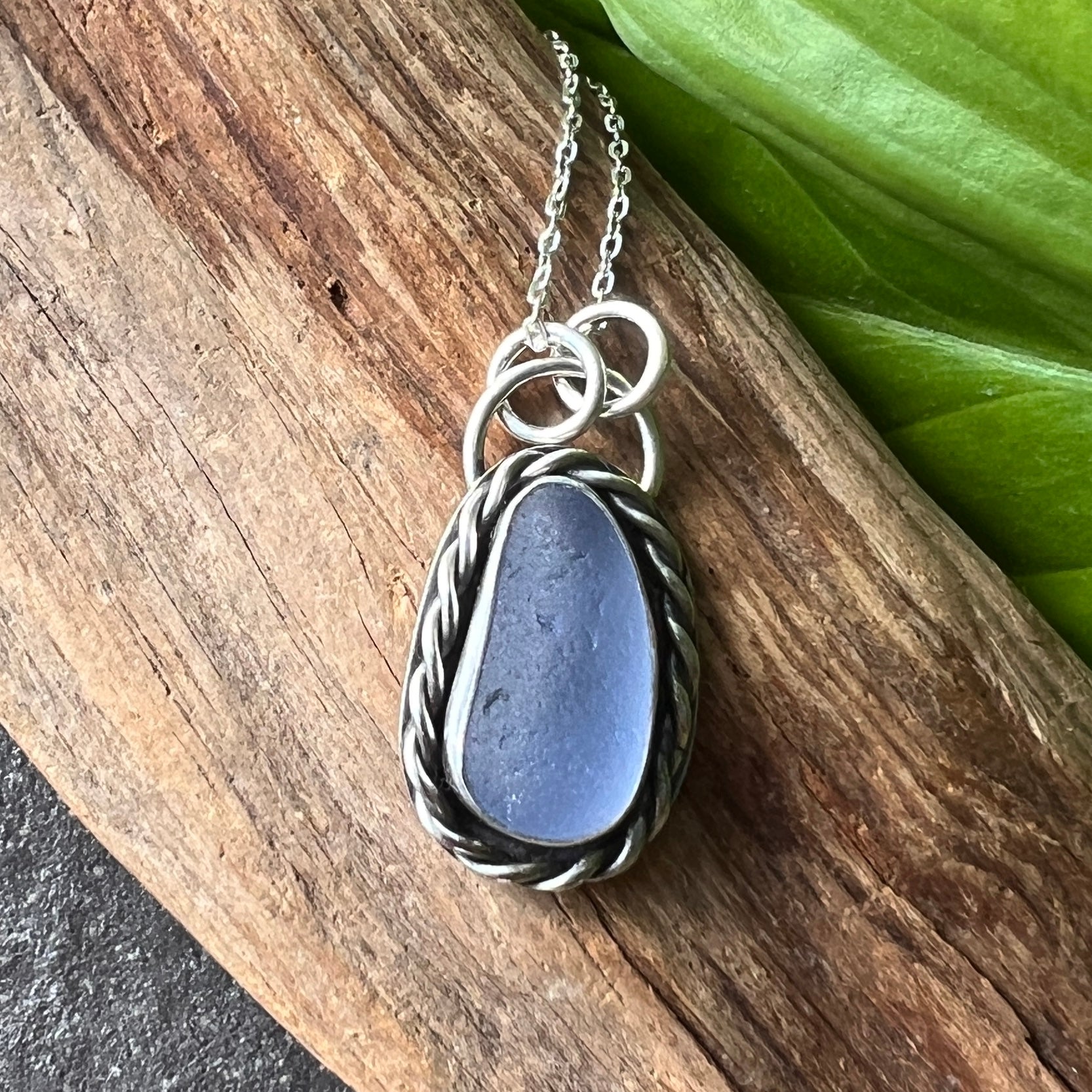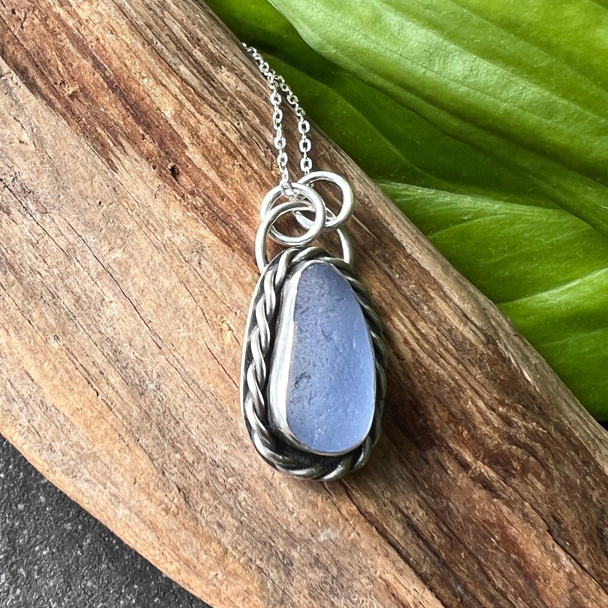 This beautiful periwinkle blue sea glass has been wrapped with fine silver bezel, mounted on a sterling silver back plate and setting.