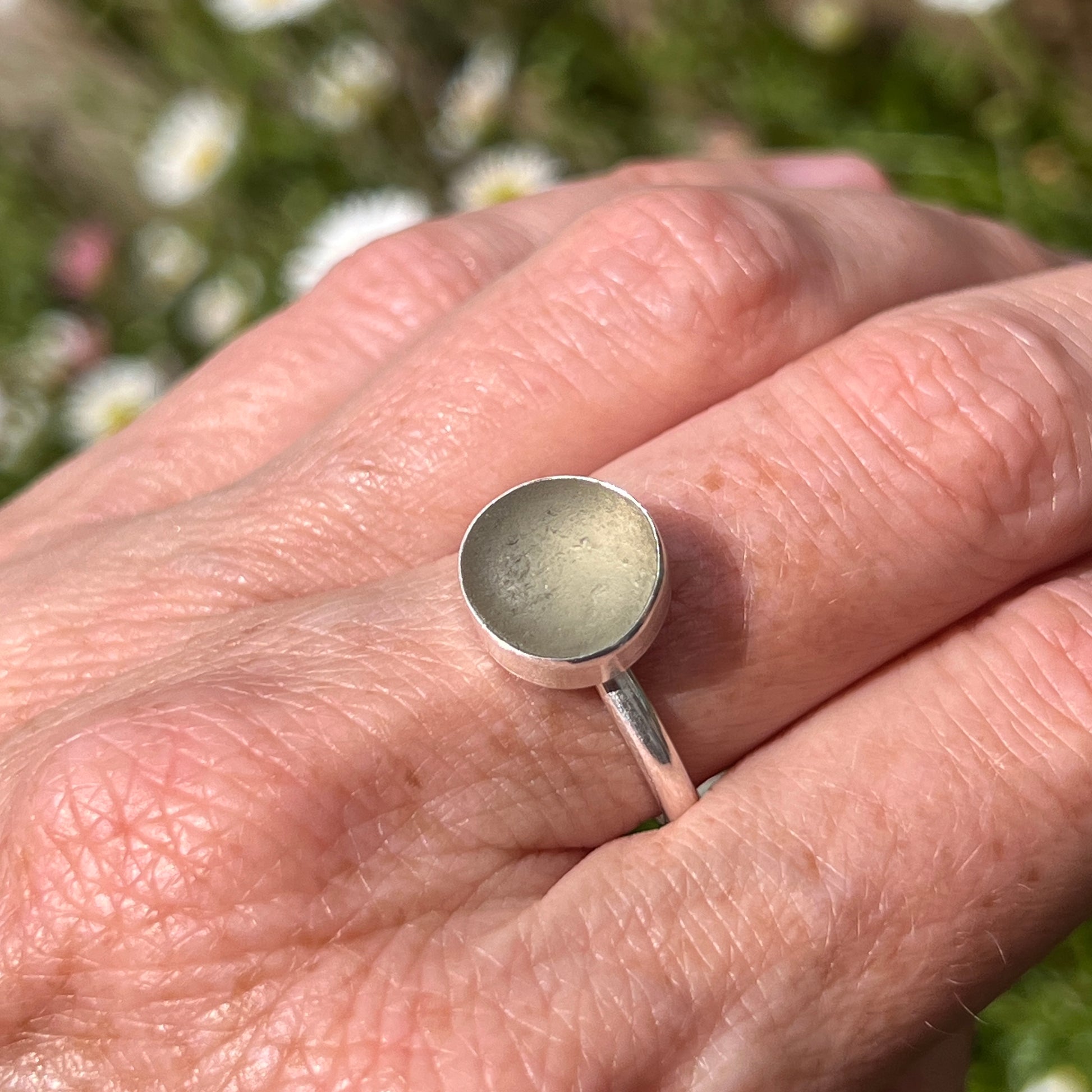 Made with a lovely piece of English sea glass, wrapped in a fine silver bezel set on a sterling silver back plate and on a sterling silver band.