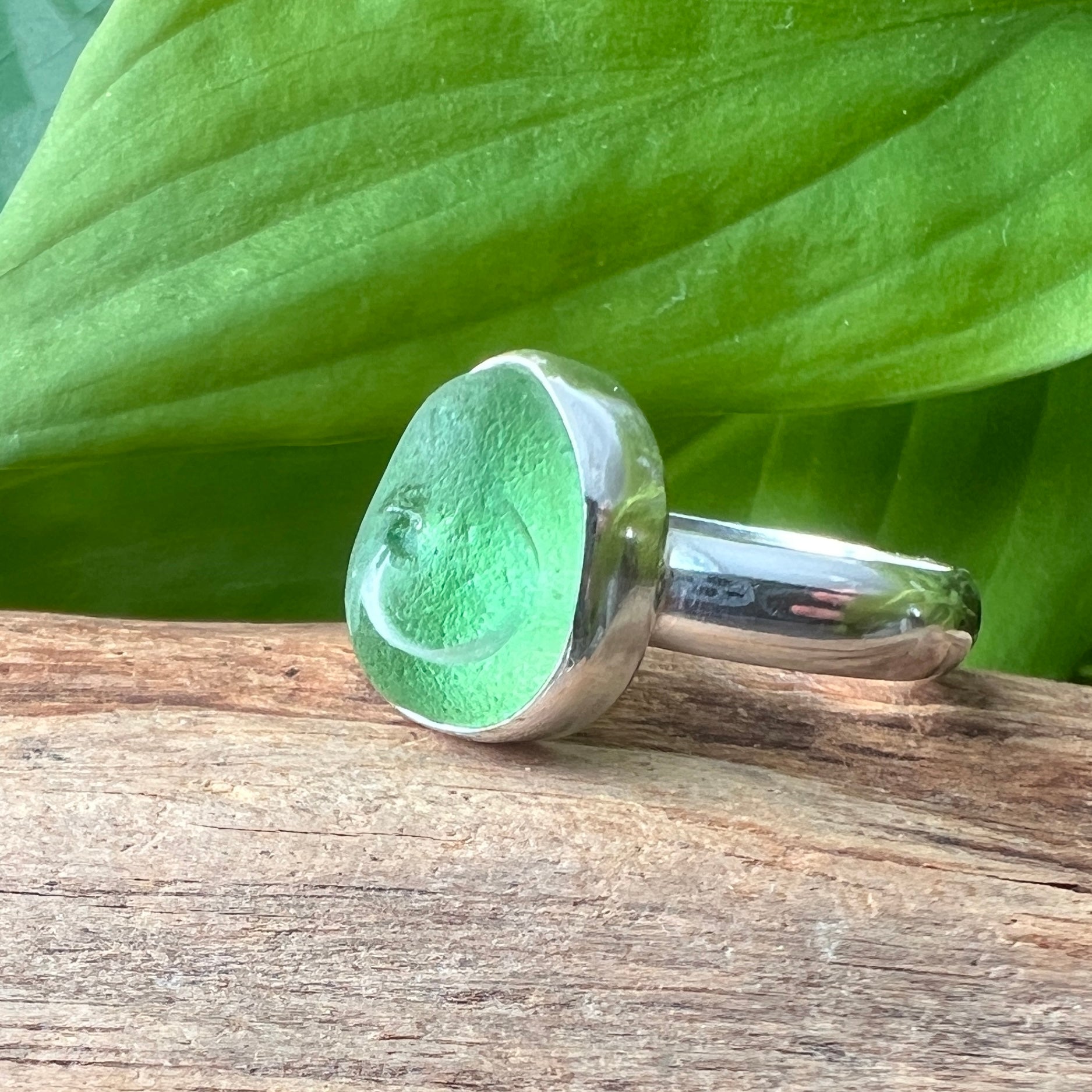 Made with a lovely piece of English sea glass, wrapped in a fine silver bezel set on a sterling silver back plate and on a sterling silver band.