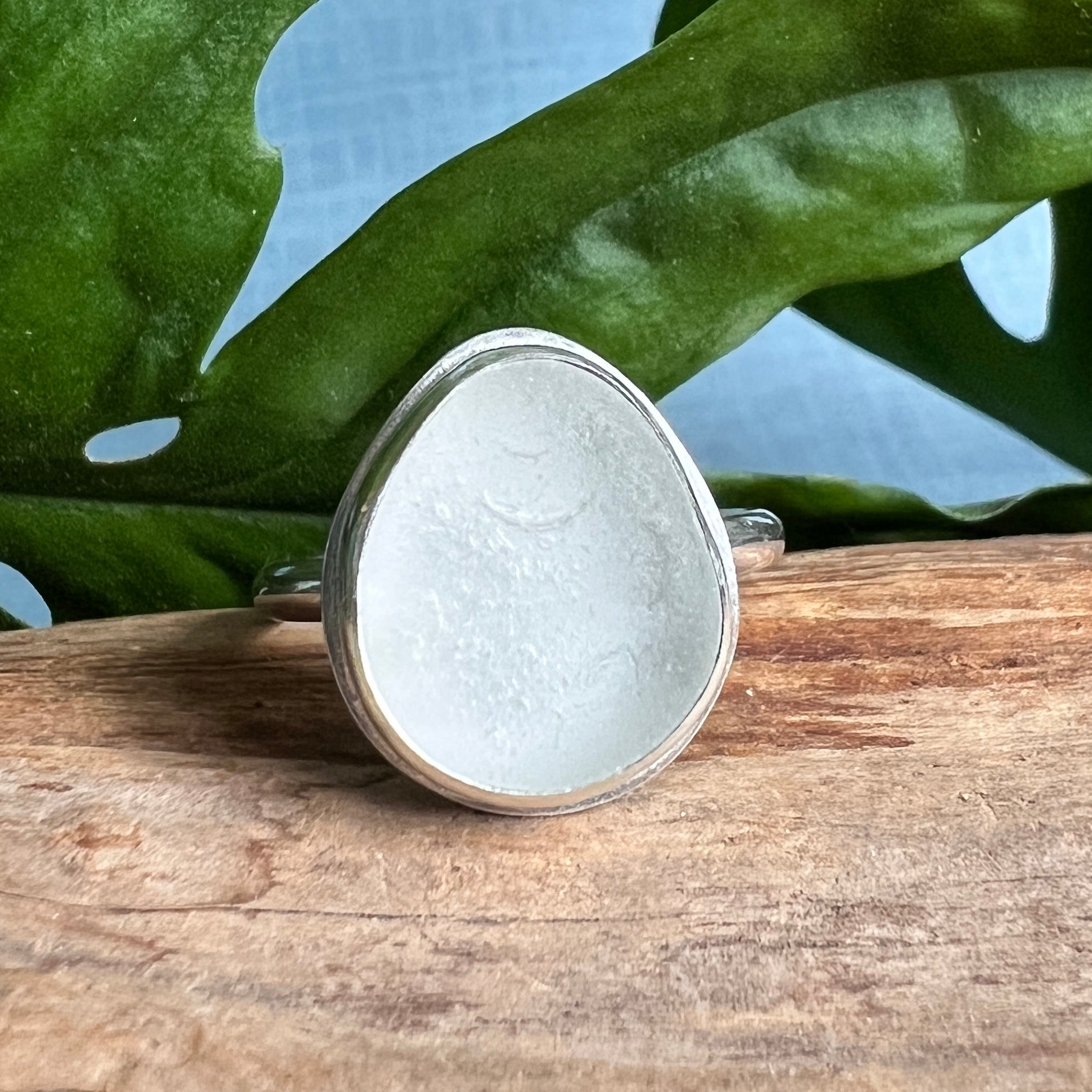 Made with a pretty piece of English sea glass, wrapped in a fine silver bezel set on a sterling silver back plate and on a double sterling silver band.