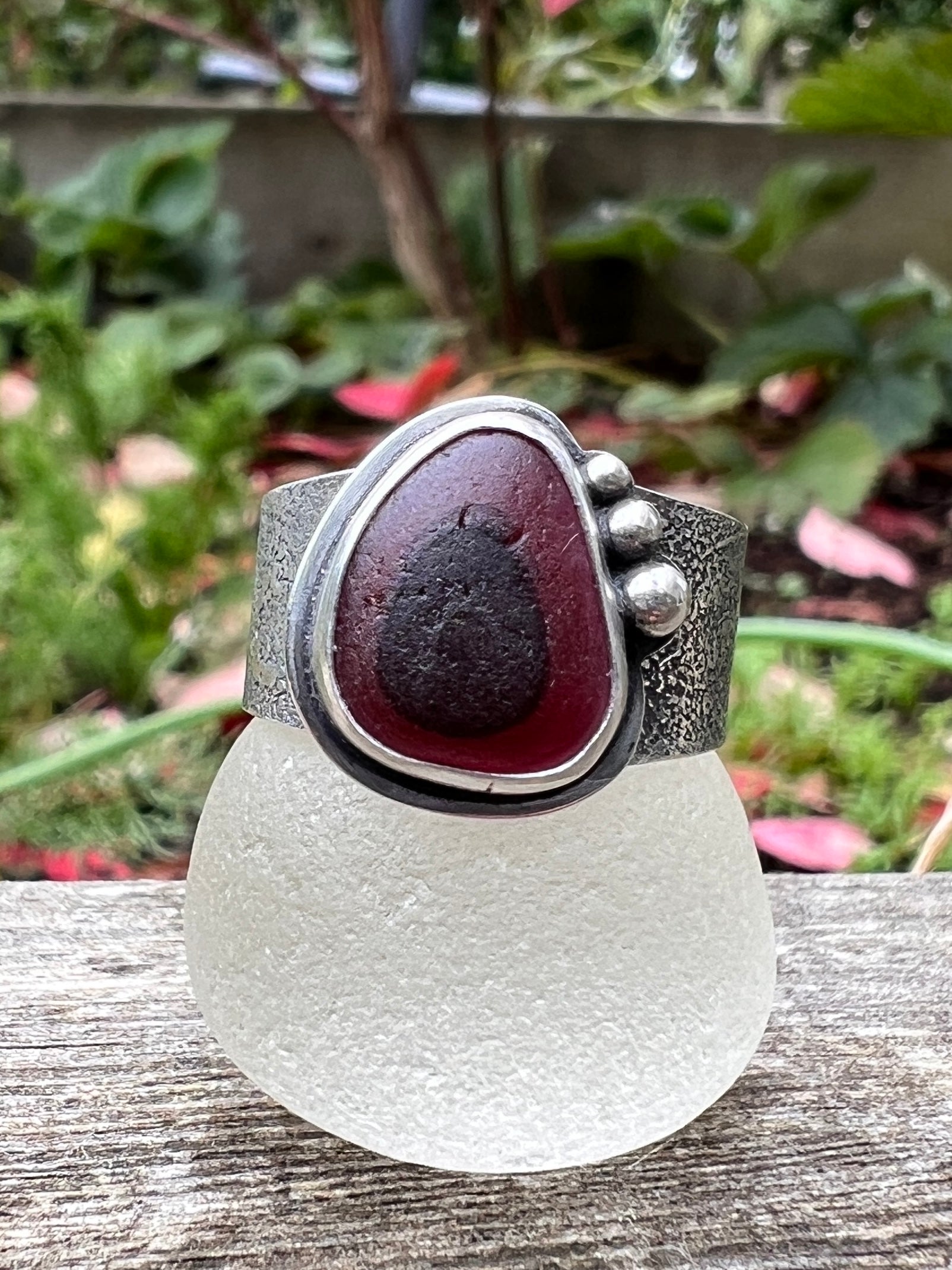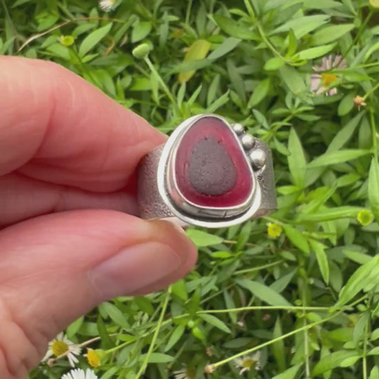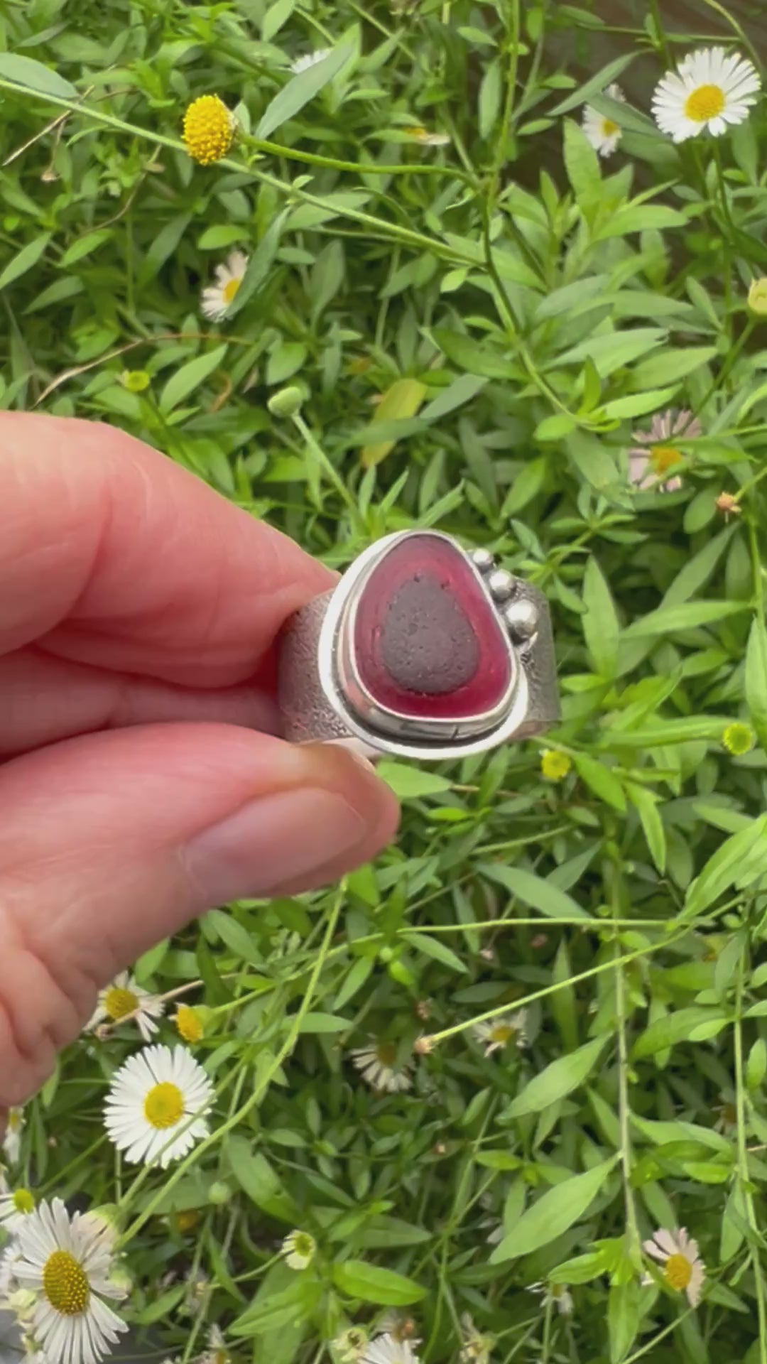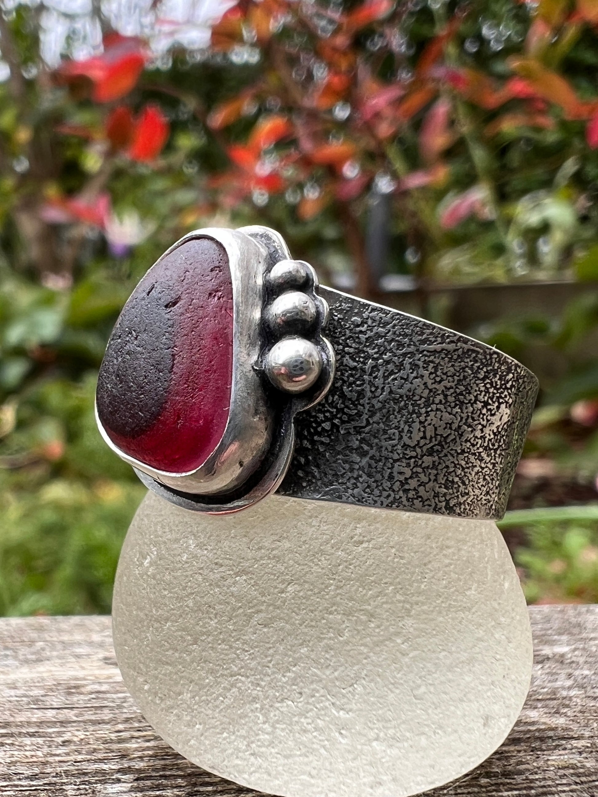 Made with a beautiful piece of pink and purple sea glass, wrapped in a fine silver bezel set on a sterling silver back plate and on a wide sterling silver band.