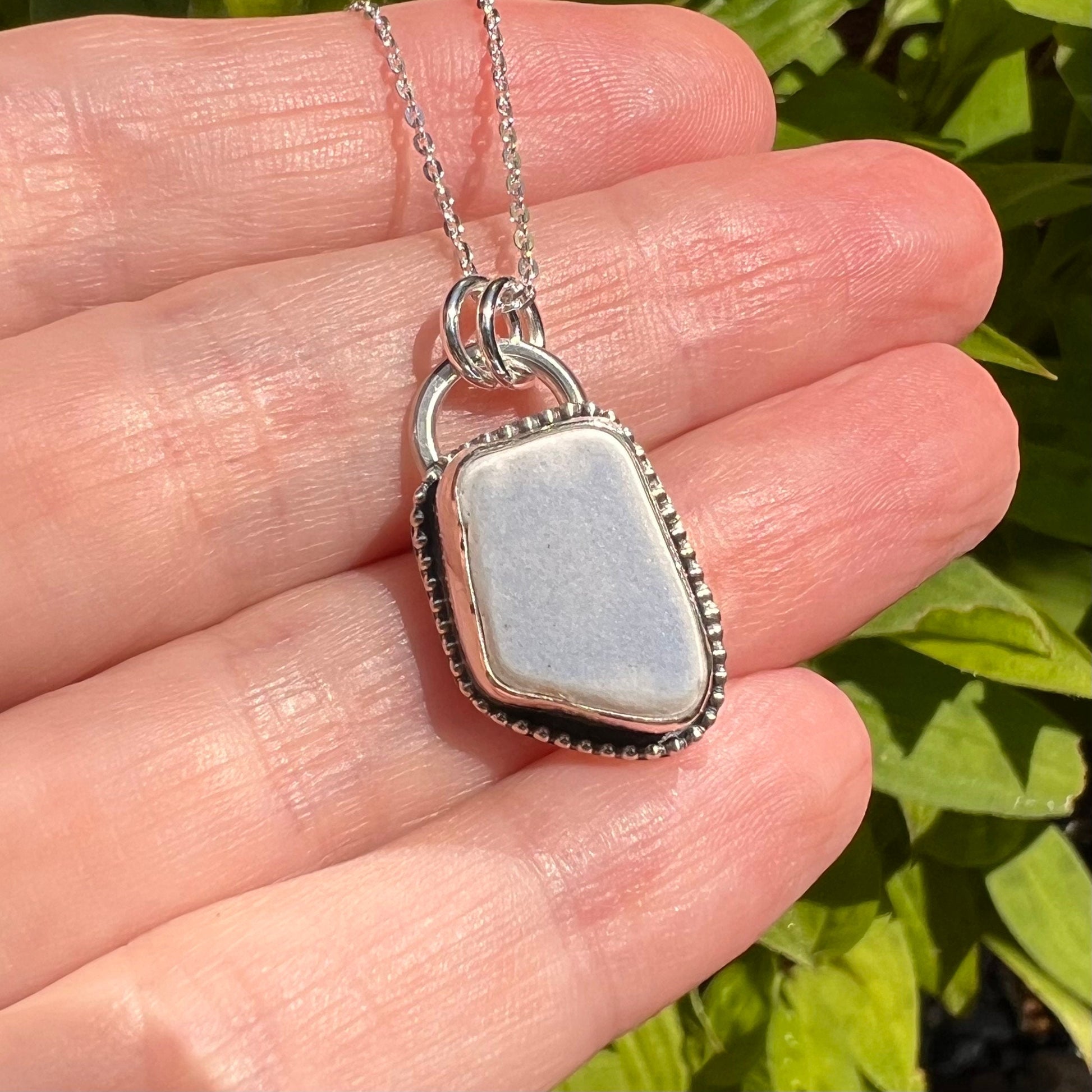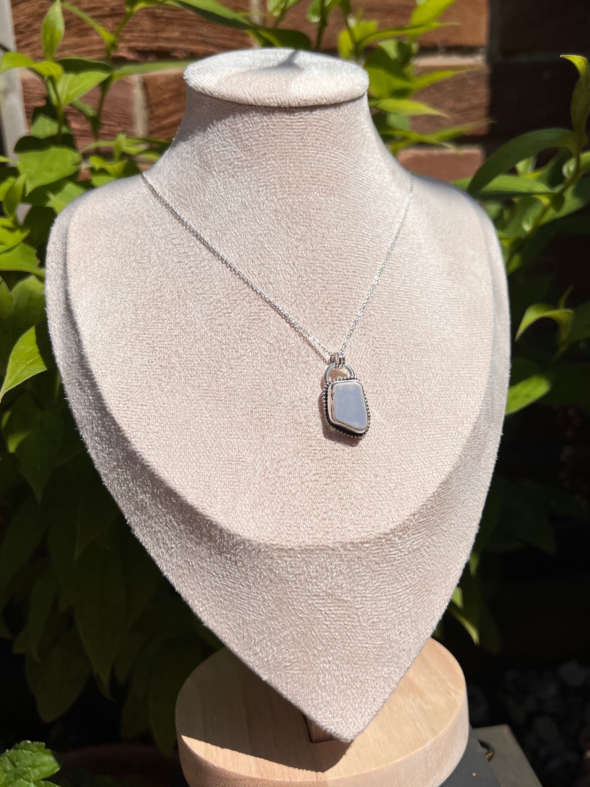 Sterling silver, fine silver and a lovely pale blue piece of sea pottery have been used to create this pendant. I have surrounded the piece with beaded wire to add a bit more interest to the piece.