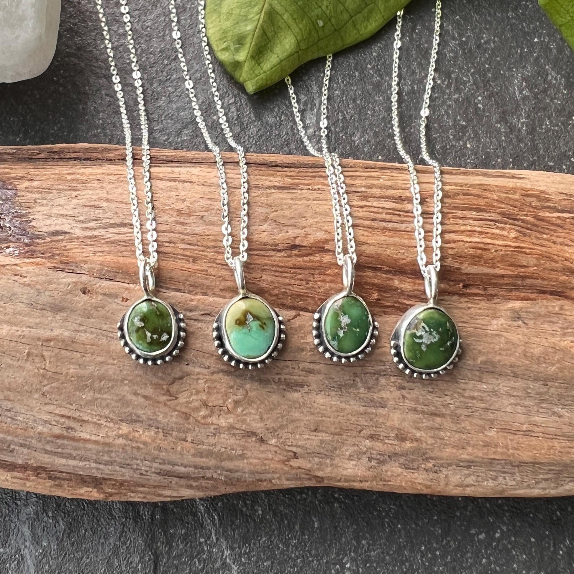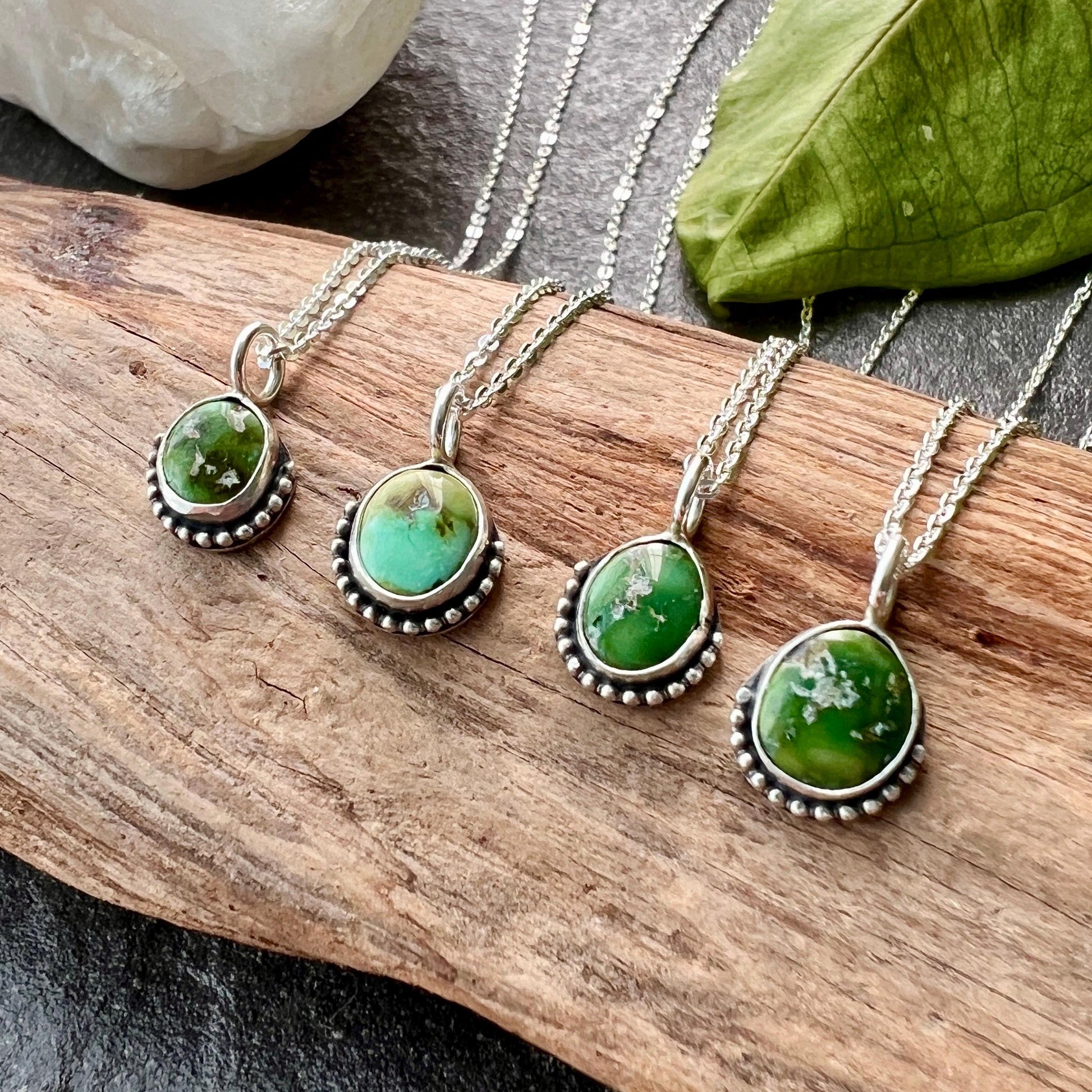 These dainty Sonoran Lime Turquoise pendants are perfect for everyday wear. Each cabochon has been wrapped in a fine silver bezel, mounted on a sterling silver back plate.